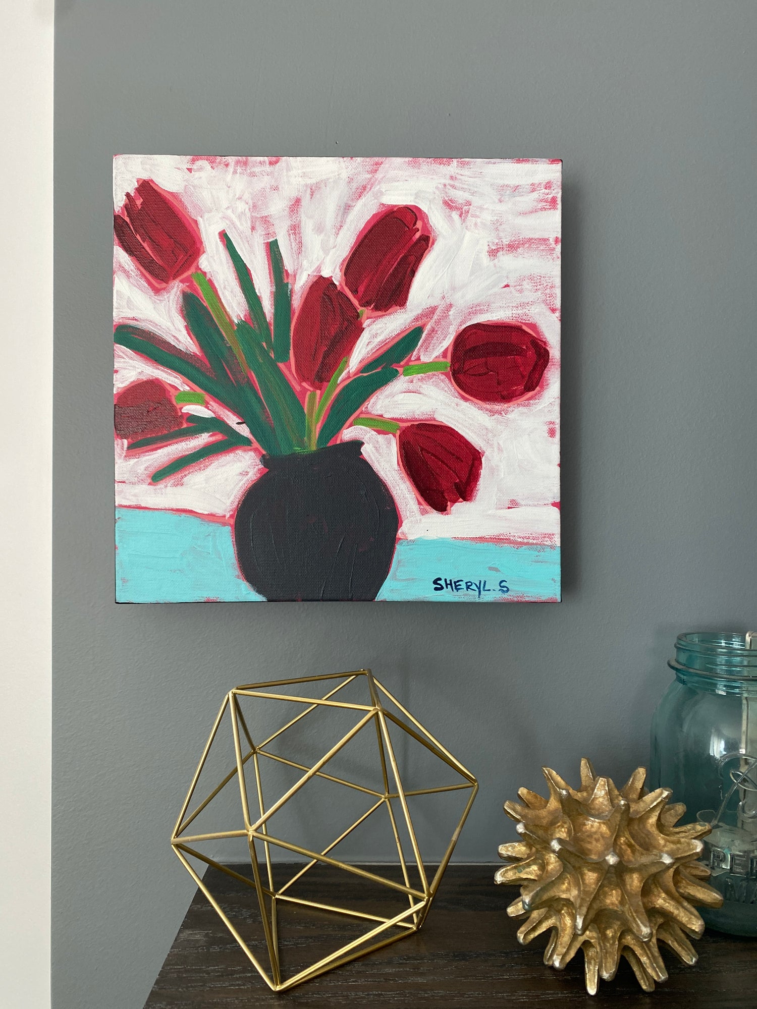 Red Tulips / Original Wall Art on Canvas 12”x12” /