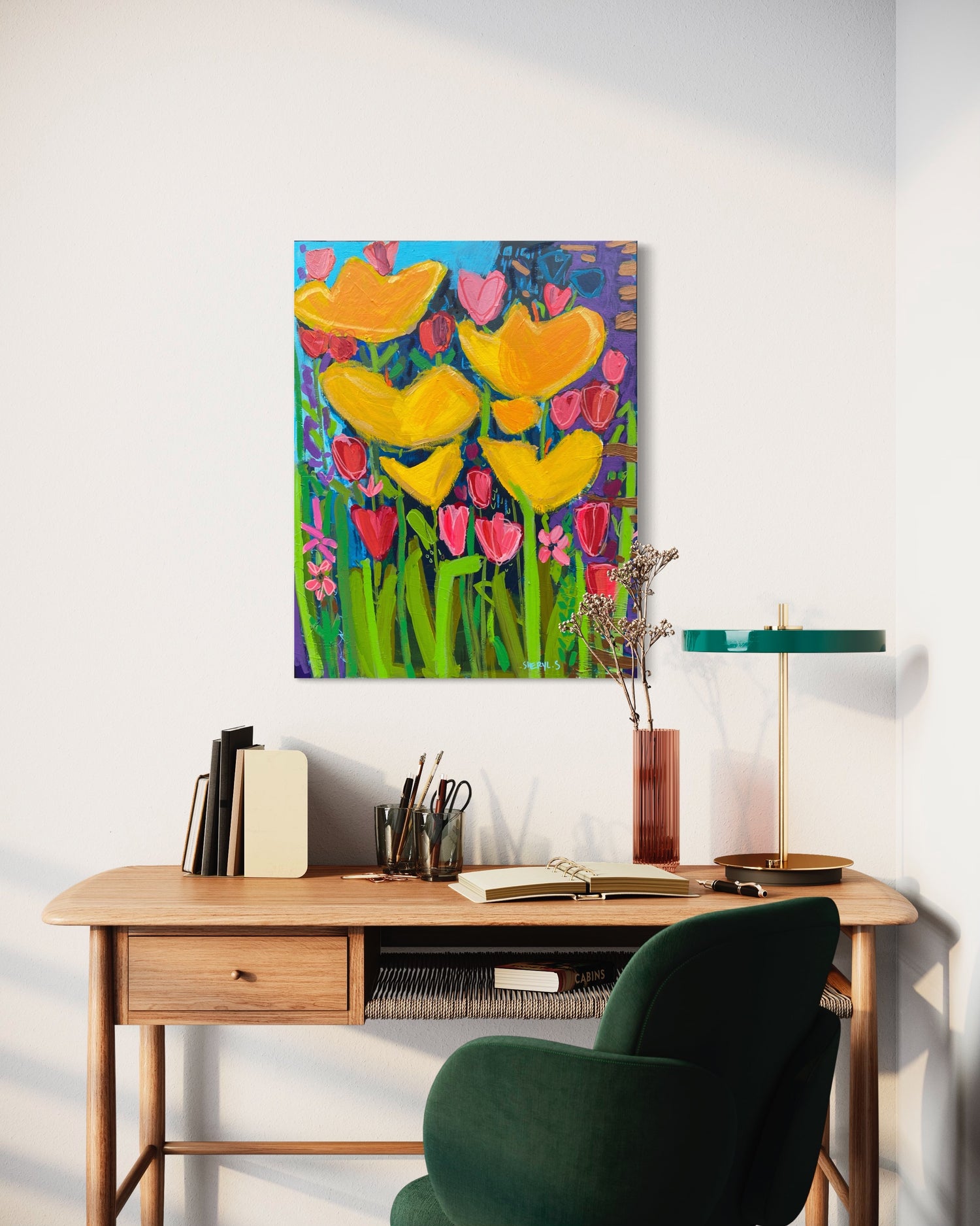 Original Art / Yellow Flowers with Pink and Red Tulips/ Botanical Wall Art